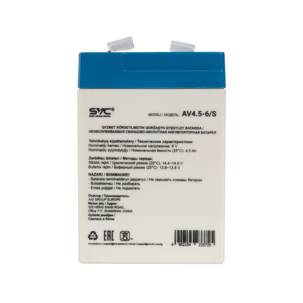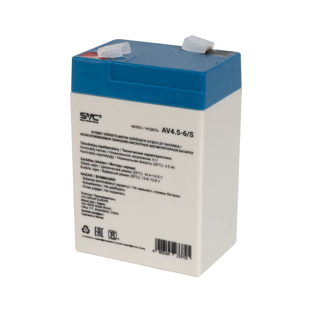 Батарея, SVC, AV4.5-6/S, Свинцово-кислотная 6В 4.5Ач, Вес нетто: 0,76 кг, Размер в мм.: 70*48*106