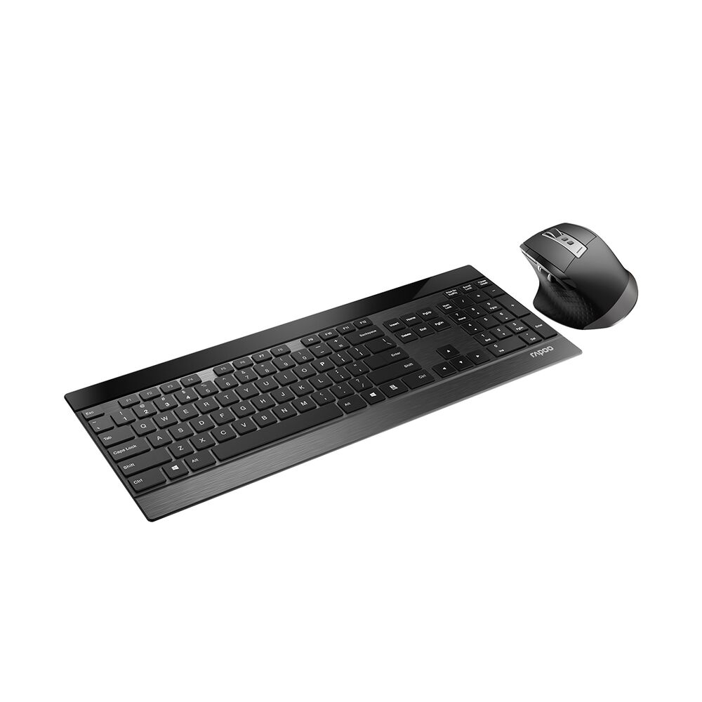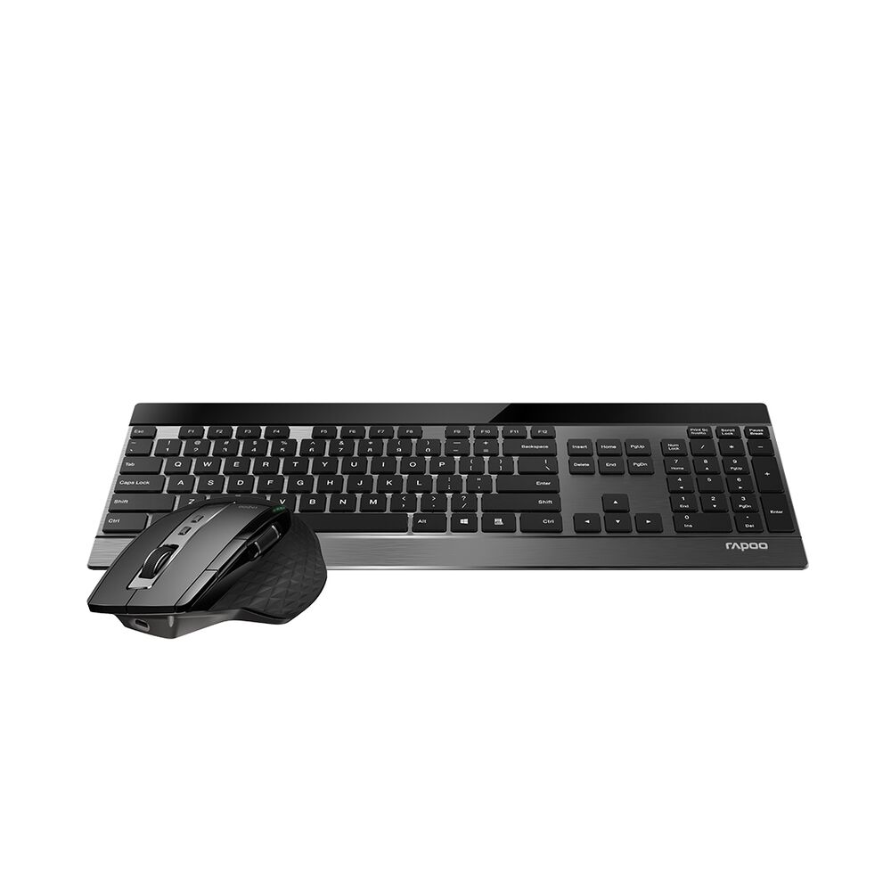 Комплект Клавиатура + Мышь, Rapoo, 9900M, Беспроводная 2.4G, Bluetooth 3.0, 4.0, 3200DPI, Нано-ресивер, Кол-во стандартных клавиш 104, Рус/Англ, Алюминий, Чёрный,