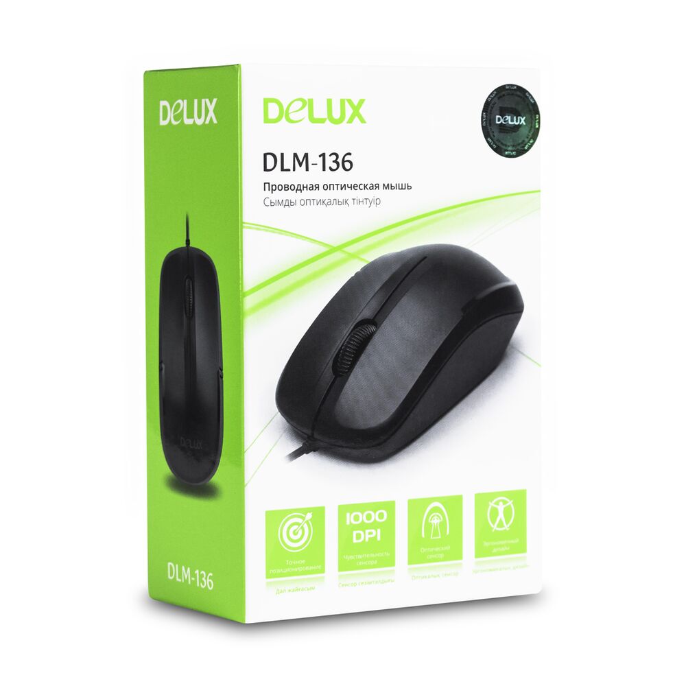 Компьютерная мышь, Delux, DLM-136OUB, Оптическая, USB, 1000dpi, Длина провода 1,6 м, Чёрная
