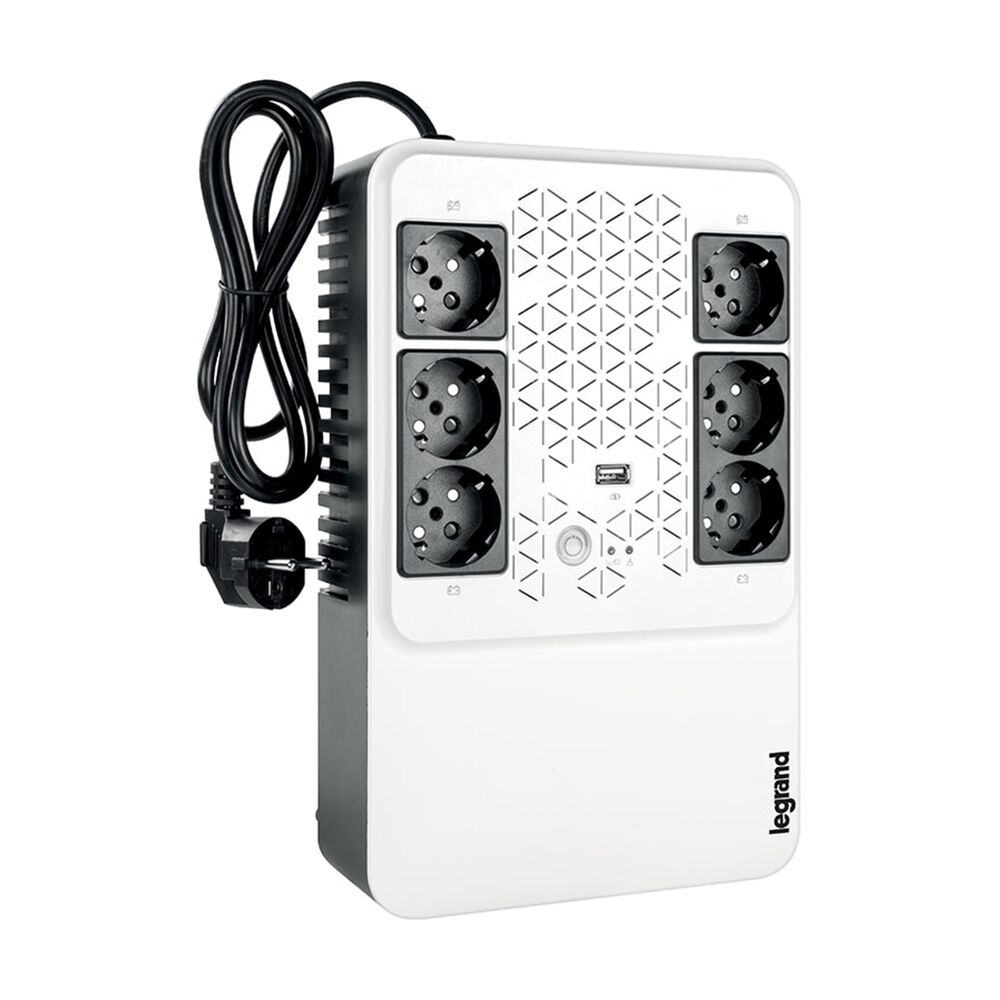 Источник бесперебойного питания, Legrand, Keor Multiplug 800 ВА 310082, Мощность 800ВА/480Вт, Линейно-интерактивный, Напольный, LED индикаторы/USB, Диапазон работы AVR:170-290В, Бат.: 12В/7Ач., Вых: 6xSchuko, Чёрно-белый