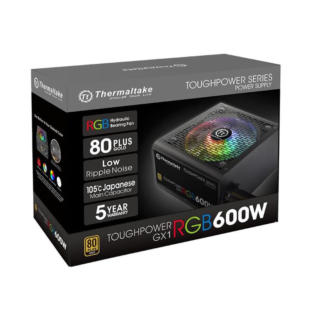 Блок питания, Thermaltake, Toughpower GX1 RGB 600W, PS-TPD-0600NHFAGE-1, 600W, ATX, Gold, APFC, 20+4 pin, 4+4pin, 8*Sata, 4*Molex, 2*PCI-E 6+2 pin, FDD, non-modular, Вентилятор RGB 12 см, Чёрный